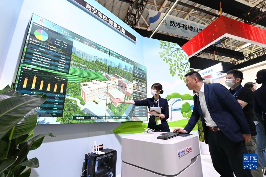 4月26日,數(shù)字福建建設(shè)成果專區(qū)工作人員在展覽現(xiàn)場向參觀者介紹數(shù)字高校智慧大腦綜合管理平臺(tái),該平臺(tái)由福建師范大學(xué)和中國電信福州分公司聯(lián)手打造。新華社記者 林善傳 攝