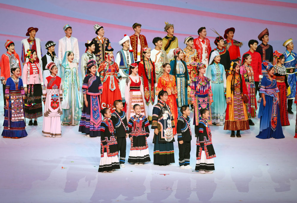 7月28日,吉好有果(中)在成都大運(yùn)會(huì)開幕式上歌唱。新華社記者 陳澤國(guó) 攝