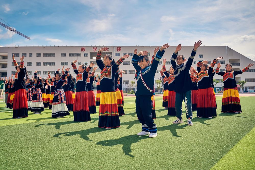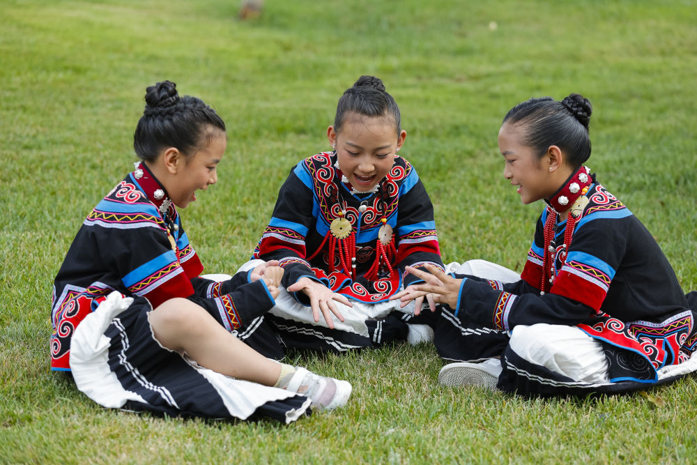 7月2日,在昭覺(jué)縣萬(wàn)達(dá)融創(chuàng)紅絲帶愛(ài)心學(xué)校參與排練的俄地惹漢(前左)、馬杰英(前中)和吉合拉作(前右)。(受訪者供圖)