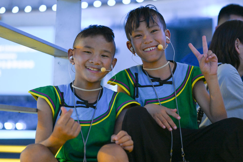 7月16日,在成都大運(yùn)會(huì)開幕式彩排現(xiàn)場(chǎng)拍攝的候場(chǎng)中的吉子醫(yī)生(左)和吉朵史拉(右)。新華社記者胥冰潔 攝