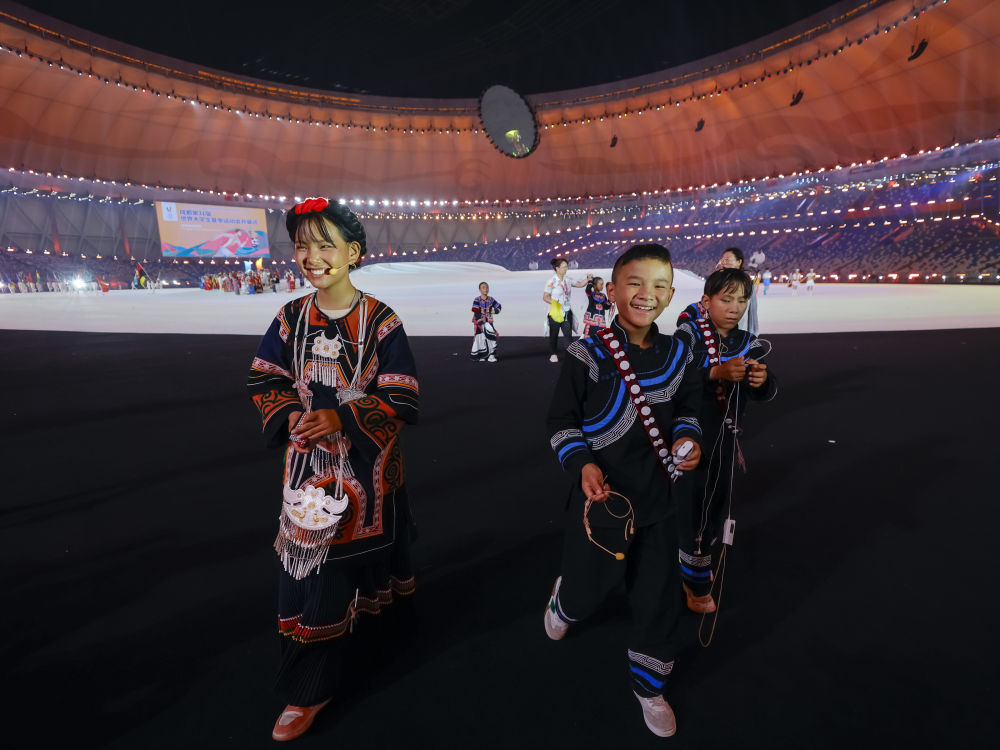 7月28日,來(lái)自四川涼山彝族自治州的孩子們?cè)诔啥即筮\(yùn)會(huì)開幕式上歌唱。新華社記者 陳澤國(guó) 攝