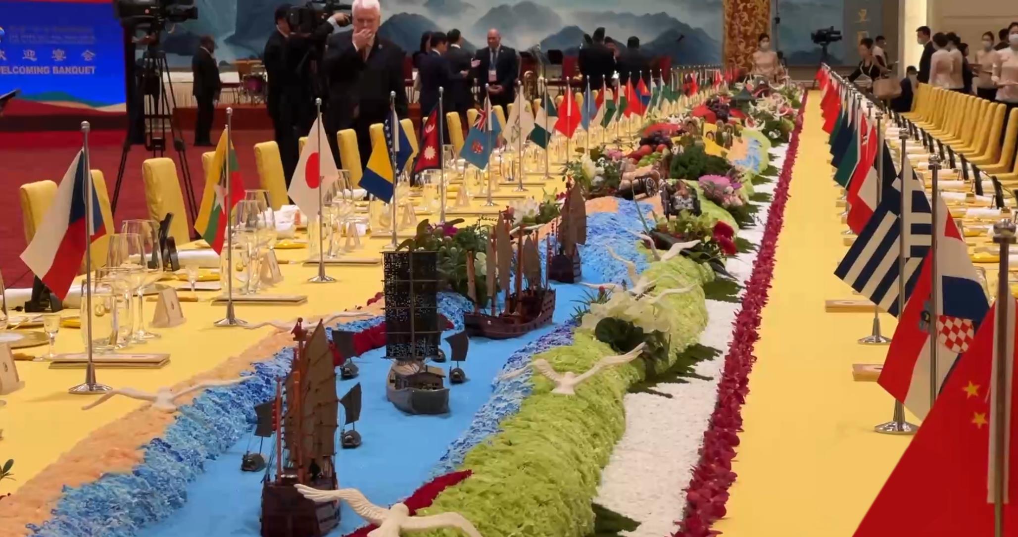 在10月17日晚舉行的歡迎宴會(huì)上,嘉賓們被這樣一個(gè)細(xì)節(jié)深深打動(dòng)——晚宴餐臺(tái)以“撫古觀今、擁抱未來(lái)”為主題,南側(cè)展示著古代絲綢之路的微觀景象:海邊碼頭上擺放著對(duì)外出口的瓷器、絲綢、茶葉等貿(mào)易物資,路上擺放有從西域引進(jìn)的蔬菜瓜果;餐臺(tái)北側(cè)為21世紀(jì)絲綢之路的景觀:以北京天壇的裝飾為起點(diǎn),中間穿插高鐵、中歐班列、新能源汽車等擺件,展現(xiàn)各國(guó)互聯(lián)互通的景象……