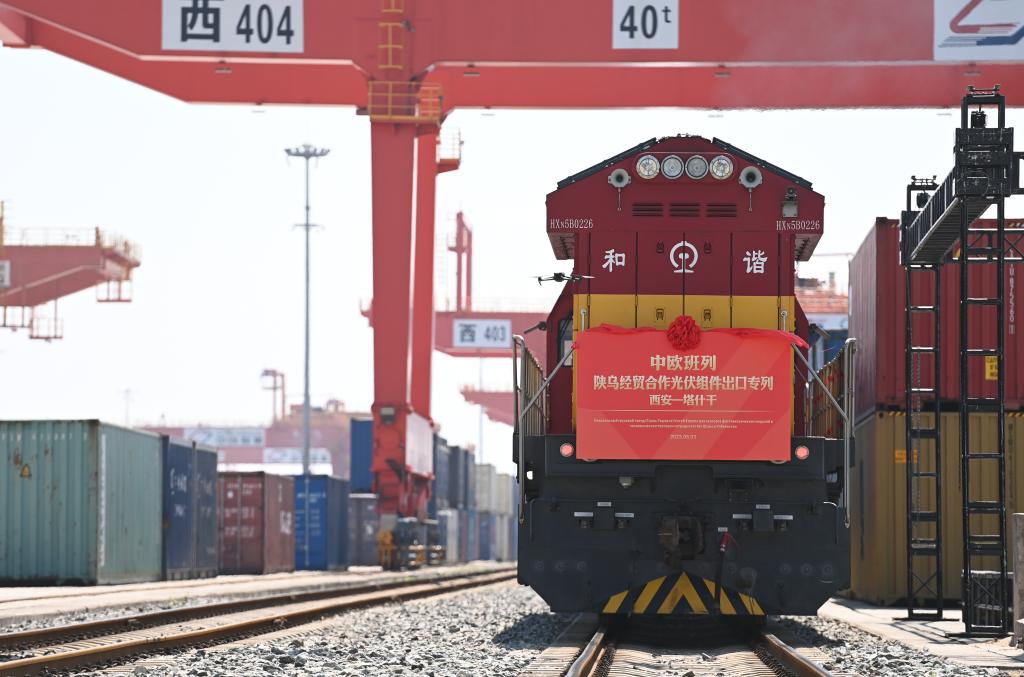 8月3日,中歐班列(西安-塔什干)陜?yōu)踅?jīng)貿(mào)合作隆基綠能光伏組件出口專列在西安國(guó)際港站準(zhǔn)備發(fā)車。新華社記者 鄒競(jìng)一 攝