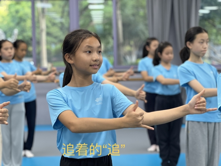 在開幕式聯(lián)排前的43天集中訓(xùn)練里,他們把大部分時(shí)間都花在了手語動(dòng)作上。在跟著“手語姐姐”牢記動(dòng)作后,一個(gè)姿勢(shì)伸多遠(yuǎn),一個(gè)角度需要打多大,都需要孩子們嚴(yán)格做到位。所以,即便在沒有集訓(xùn)的日子里,他們也會(huì)通過“群打卡”的方式上傳訓(xùn)練視頻,“小朋友哪個(gè)動(dòng)作沒做好,就定點(diǎn)保持5分鐘,然后打卡拍照,老師們也會(huì)在線上糾正動(dòng)作?!?/p>