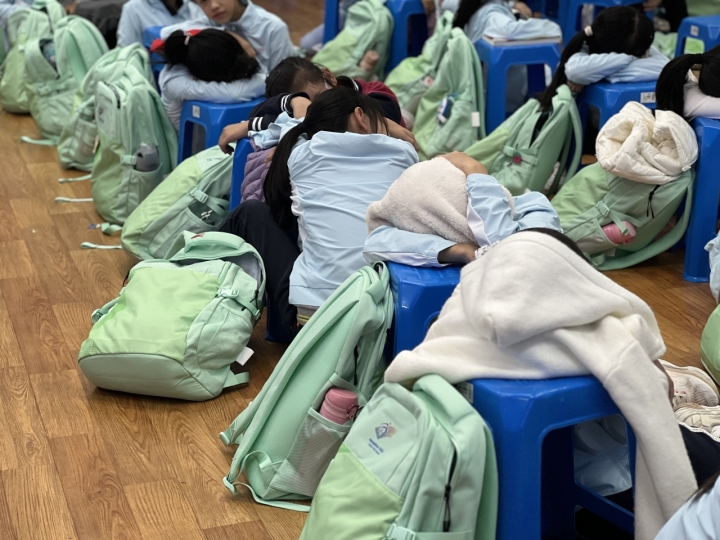 除了排練,他們還有作業(yè)和日常生活。排練現(xiàn)場(chǎng),時(shí)常能見到孩子們?cè)趭^筆疾書或者抓住碎片時(shí)間小憩,作業(yè)和打卡一次都沒落下?!拔覀?nèi)粘Mㄖ啪毜臅r(shí)候,也會(huì)喊他們帶上作業(yè),即便在開幕式上,后臺(tái)還碼著他們的書包,作業(yè)都是隨身攜帶的?!?/p>