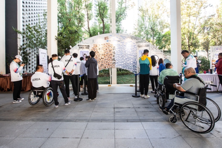 10月24日,記者走進(jìn)杭州亞殘運(yùn)村,近距離感受運(yùn)動(dòng)員們?cè)诖鍍?nèi)的生活。完善的住宿、餐飲及健身等設(shè)施外,記者發(fā)現(xiàn),亞殘運(yùn)村還有個(gè)“最熱門”打卡地。該區(qū)域由螞蟻集團(tuán)支持打造,運(yùn)動(dòng)員可以通過AI寫真、參觀“非視覺”攝影展、現(xiàn)場學(xué)中文等多種方式,帶走專屬“杭州記憶”。在現(xiàn)場的祝福墻,運(yùn)動(dòng)員寫下了600多張祝???,出現(xiàn)頻率最多的是“我愛杭州”“謝謝杭州”。