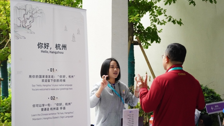 為了幫助各國運(yùn)動(dòng)員了解中國文化、了解杭州,體驗(yàn)區(qū)現(xiàn)場設(shè)置了學(xué)中文趣味體驗(yàn)環(huán)節(jié)。體驗(yàn)者只要跟著志愿者現(xiàn)場學(xué)說十個(gè)諸如“杭州”、“西湖龍井”、 “片兒川”等簡單詞匯,或者學(xué)用手語打出相關(guān)詞匯,就可以獲得以西湖美景為主題的紀(jì)念徽章。