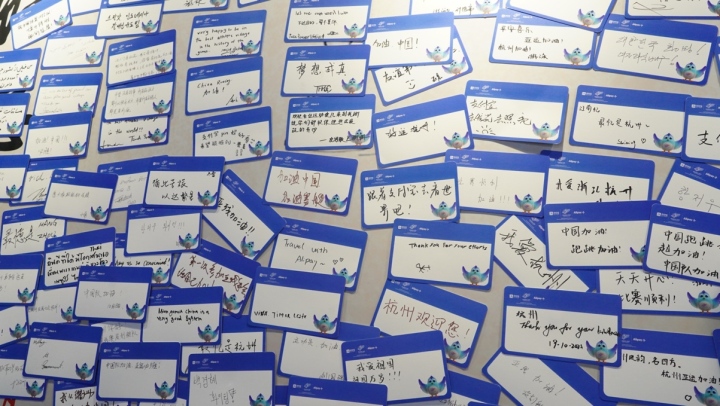 記者注意到,在體驗(yàn)區(qū)現(xiàn)場的祝福墻上,貼滿了各國運(yùn)動(dòng)員和教練員們的祝??ㄆ?。有的給自己和隊(duì)友加油,有的寫了來到中國參加亞殘運(yùn)會(huì)的感受,其中提及最多的,是“謝謝杭州”、“我愛杭州”。