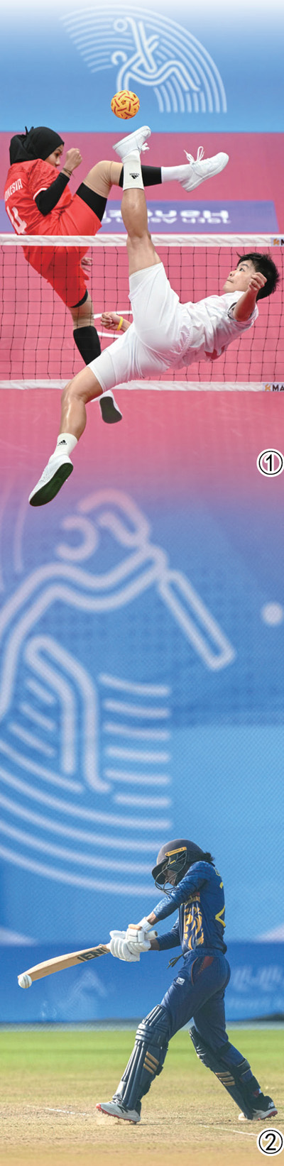 圖①:9月24日,藤球女子單組團(tuán)體預(yù)選賽,泰國體育代表團(tuán)選手曼立卡·汶托(前)對陣印度尼西亞體育代表團(tuán)選手。