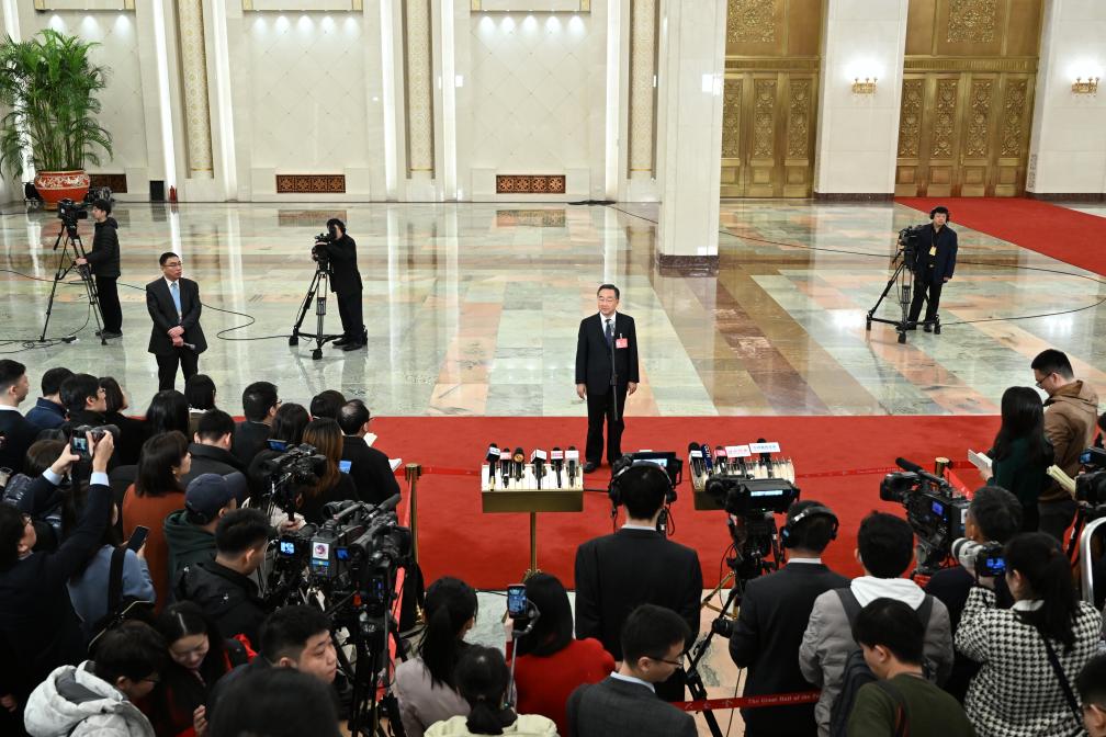 3月5日,第十四屆全國人民代表大會第二次會議首場“部長通道”集中采訪活動在北京人民大會堂舉行。這是水利部部長李國英接受媒體采訪。新華社記者 牟宇 攝