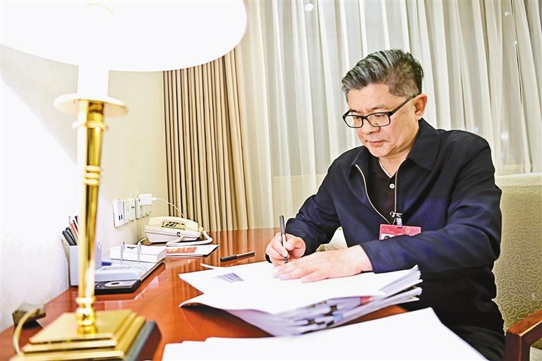 圖為全國(guó)人大代表王強(qiáng)在駐地整理發(fā)言材料。記者 旦增西旦 攝