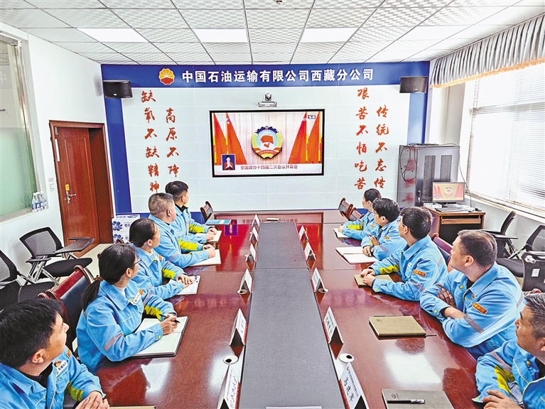 中國(guó)石油運(yùn)輸西藏分公司組織員工收看全國(guó)政協(xié)十四屆二次會(huì)議開幕會(huì)。格桑旦增 記者 次仁平措 攝