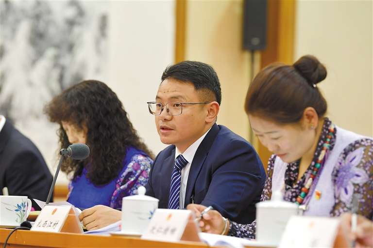 3月5日下午,十四屆全國人大二次會議西藏代表團舉行全體會議,審議政府工作報告。圖為來自隆子縣斗玉珞巴民族鄉(xiāng)的全國人大代表扎西江村在西藏代表團審議時發(fā)言。記者 旦增西旦 攝