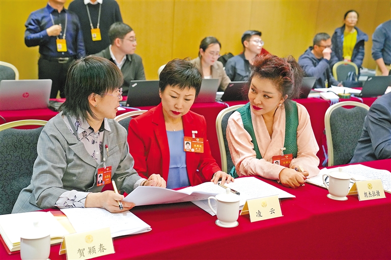 3月5日,全國政協(xié)十四屆二次會議分界別討論政協(xié)常委會工作報告和提案工作情況報告,住藏全國政協(xié)委員緊緊圍繞兩個報告,結(jié)合西藏政協(xié)工作實際,在小組討論中積極履職建言。圖為住藏全國政協(xié)委員卓嘎(左)和朗杰拉措(右)在會議結(jié)束后討論交流。