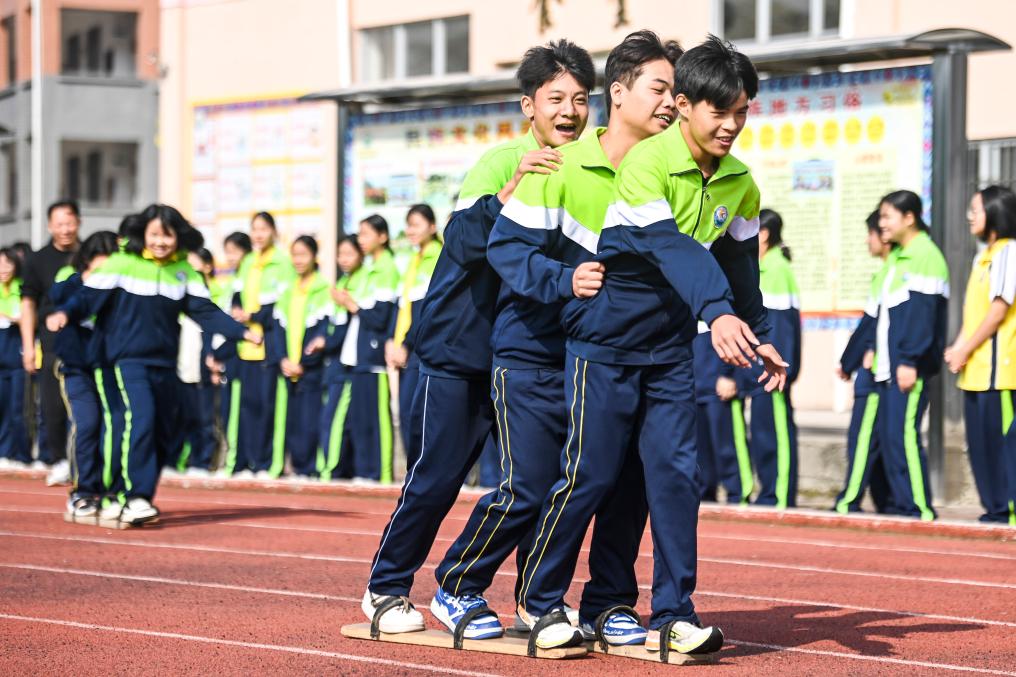 11月6日,廣西玉林市民族中學(xué)的學(xué)生們在進行板鞋競速比賽