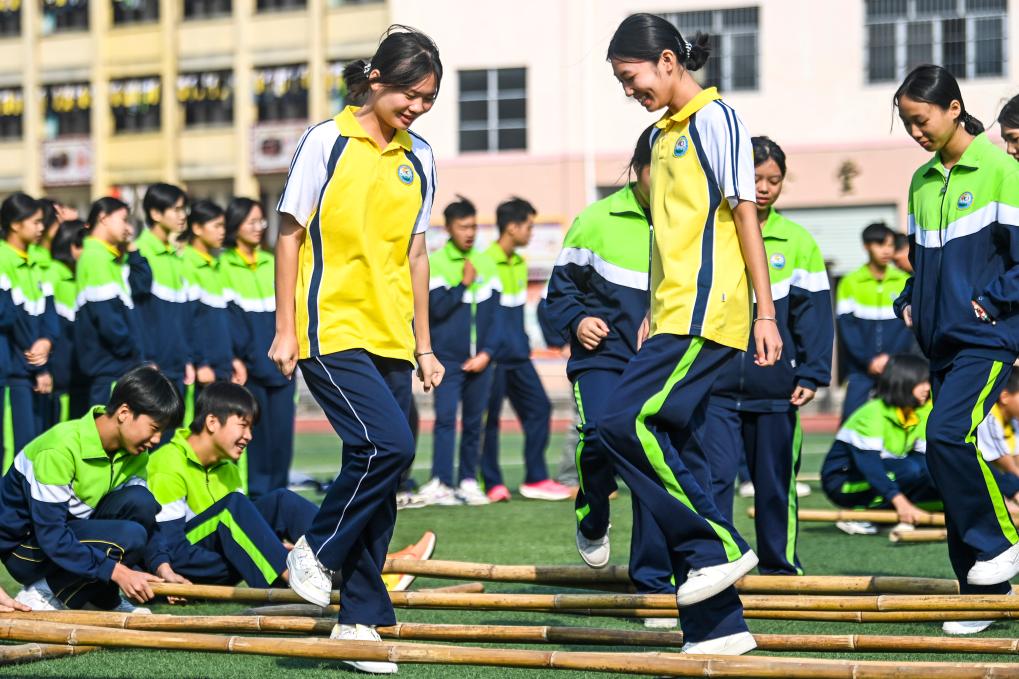 11月6日,廣西玉林市民族中學(xué)的學(xué)生們在跳竹竿舞