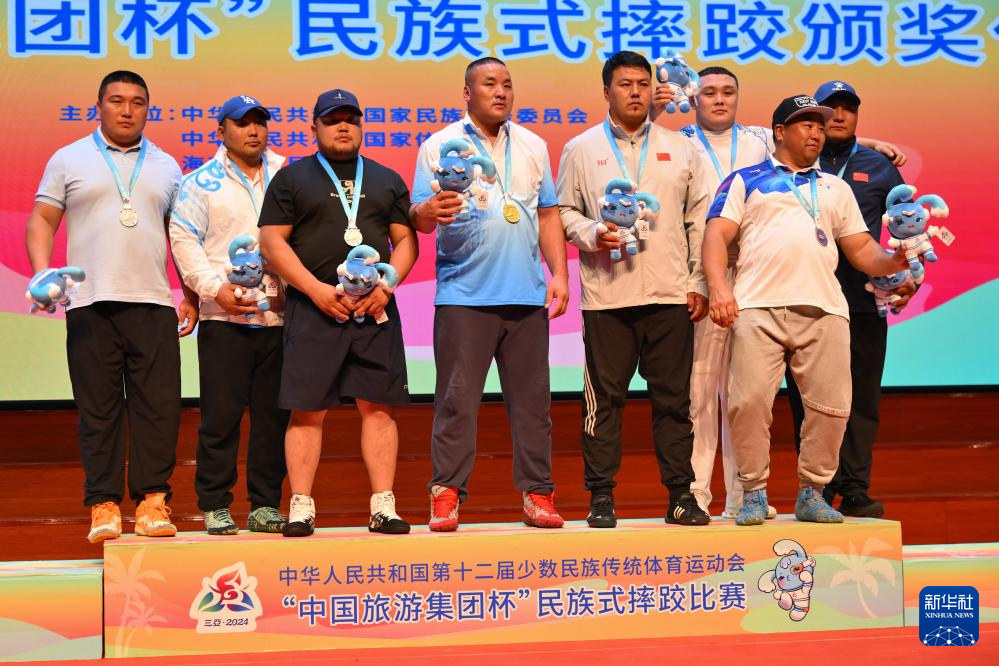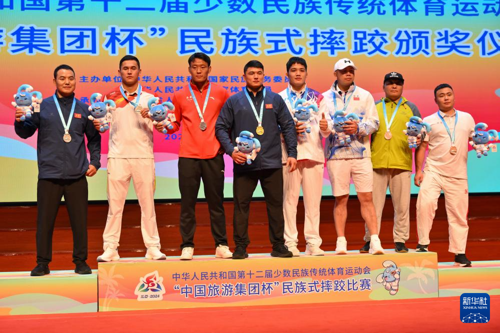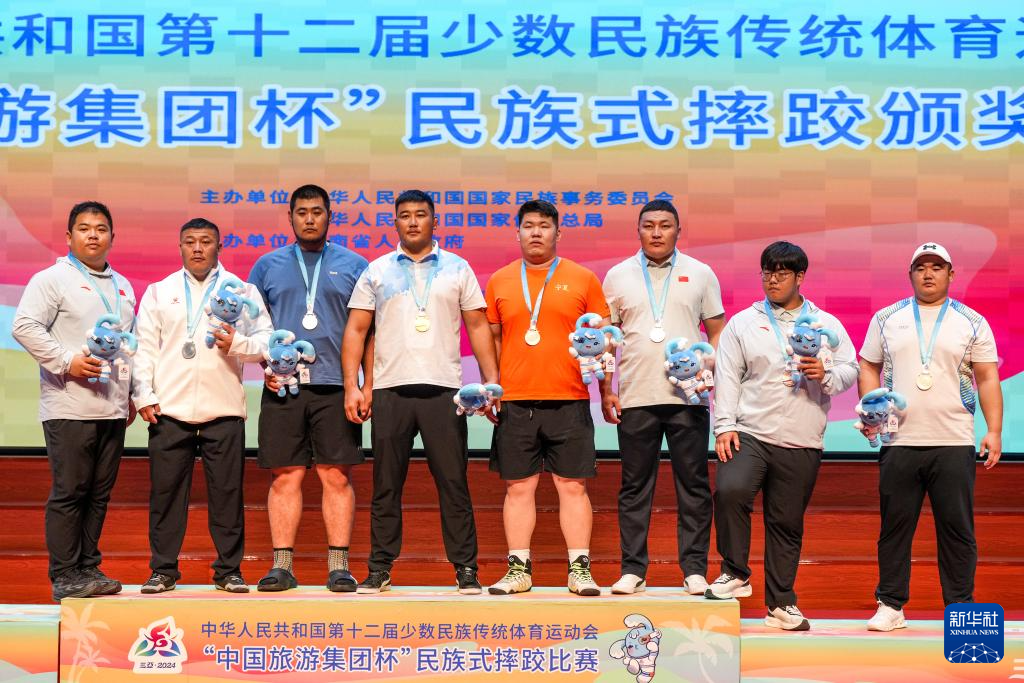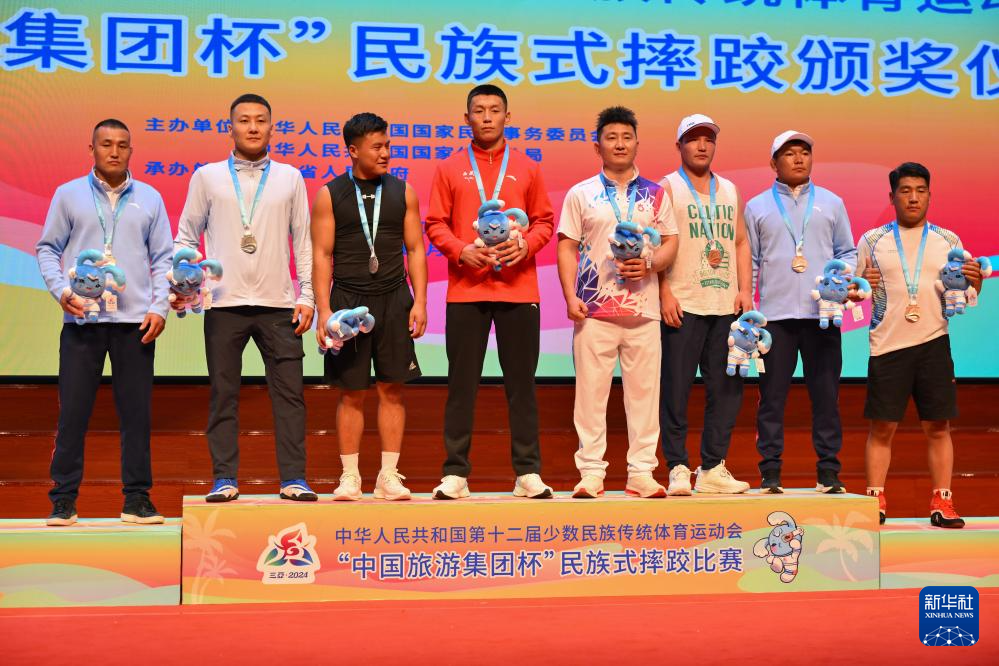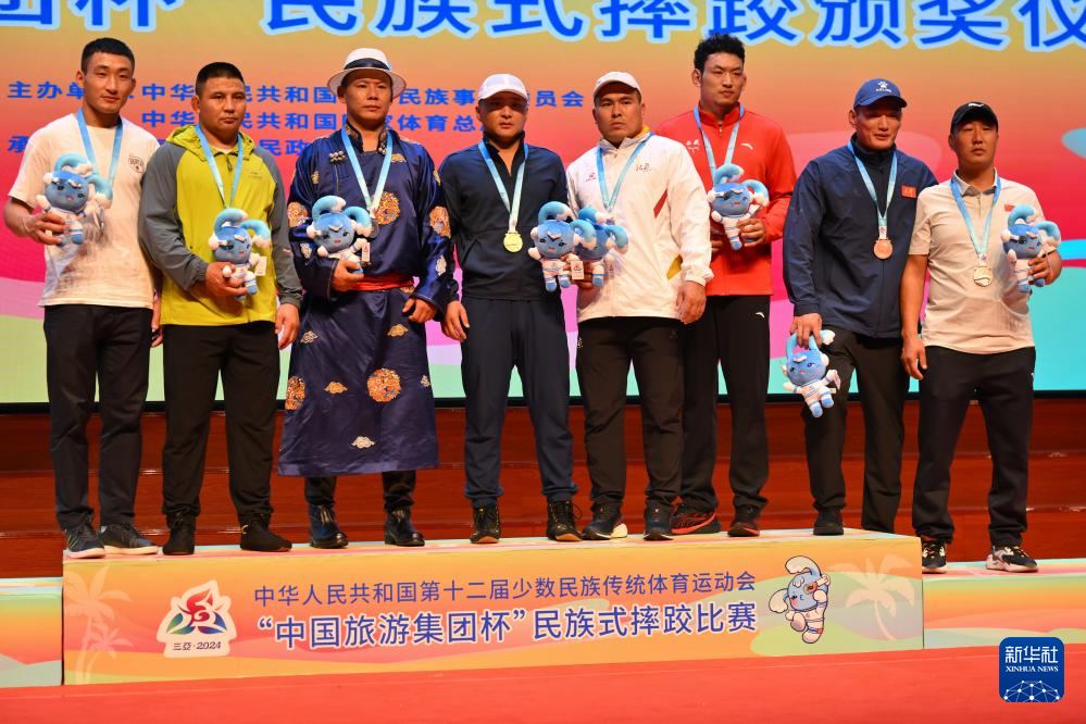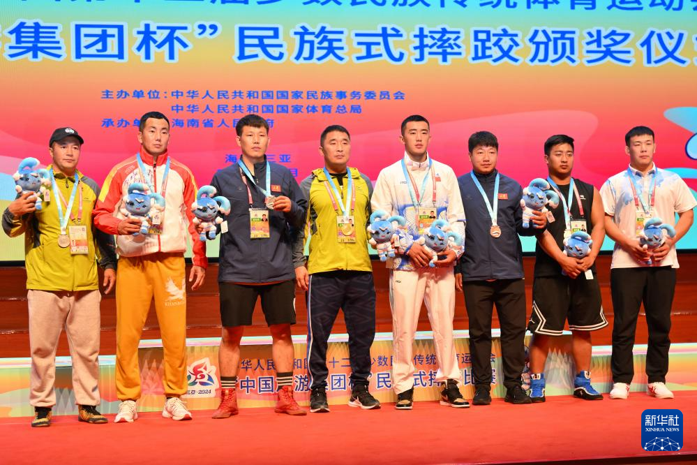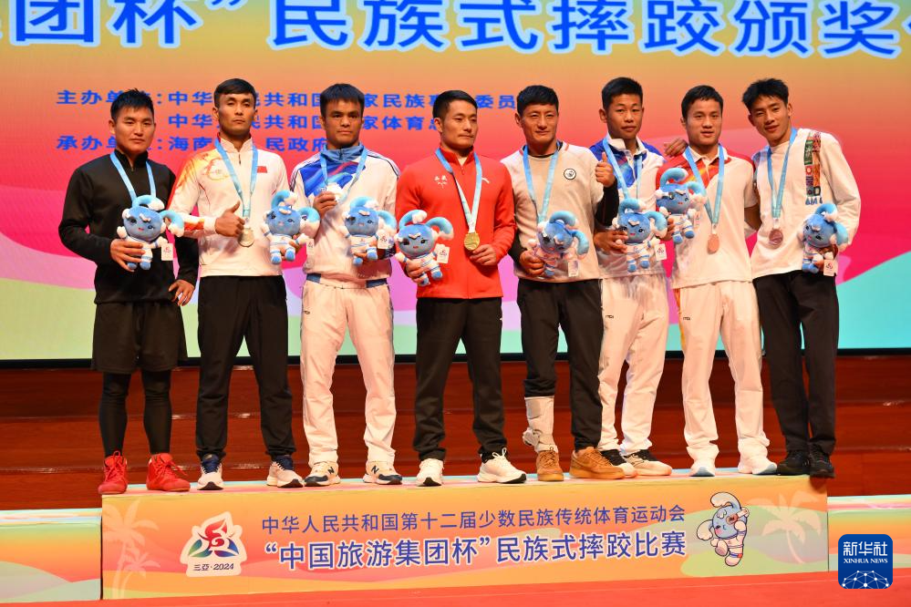 當日,第十二屆全國少數(shù)民族傳統(tǒng)體育運動會民族式摔跤項目頒獎儀式在海南省三亞市舉行。