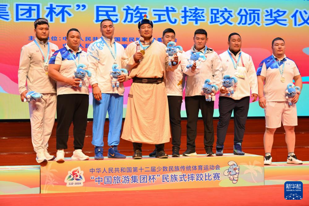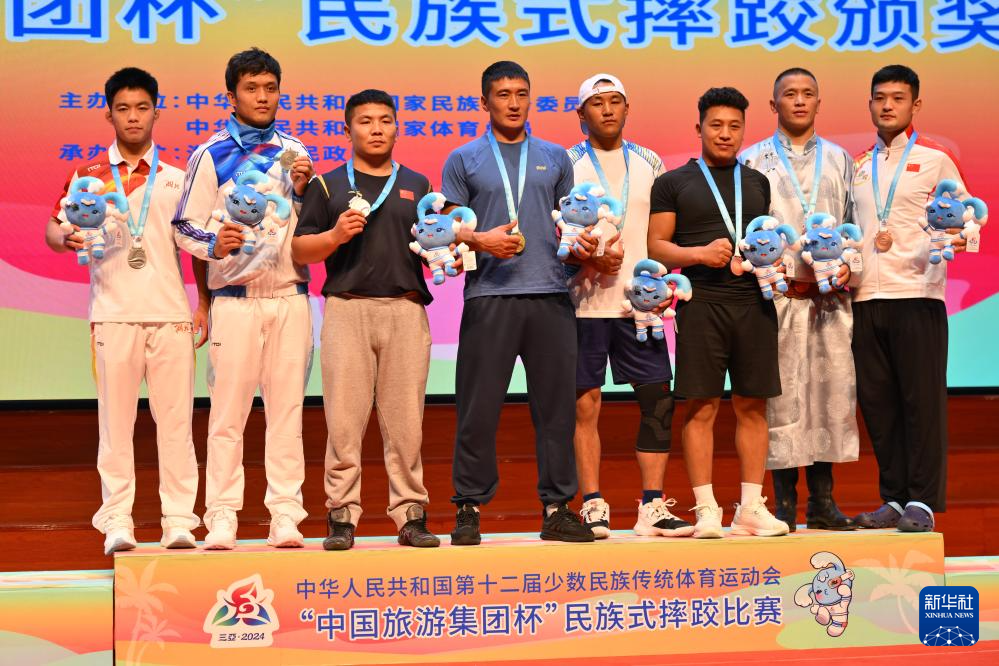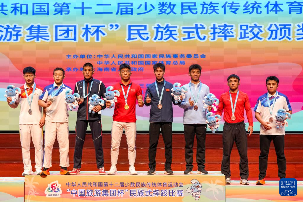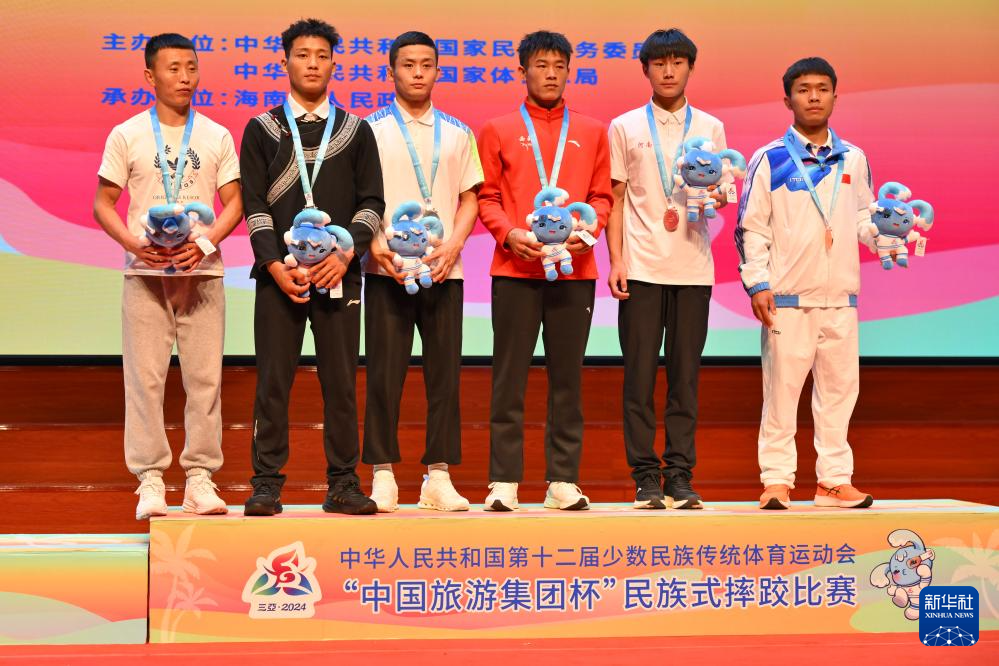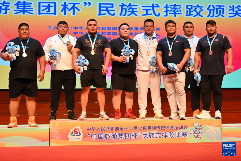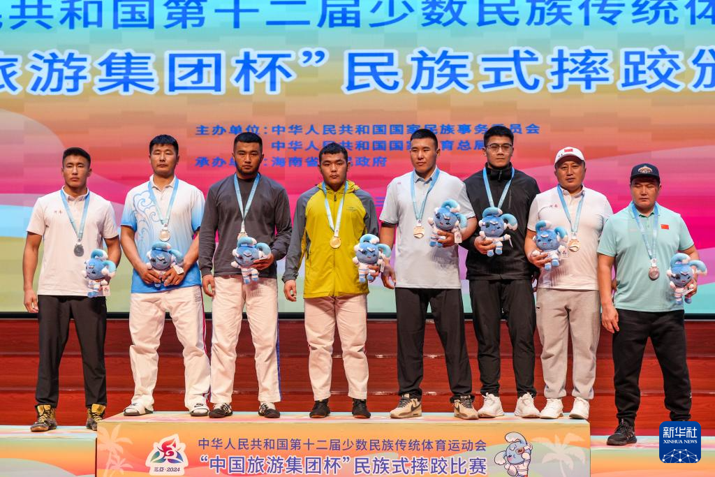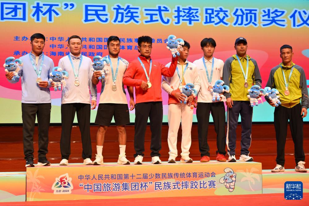 當日,第十二屆全國少數(shù)民族傳統(tǒng)體育運動會民族式摔跤項目頒獎儀式在海南省三亞市舉行。