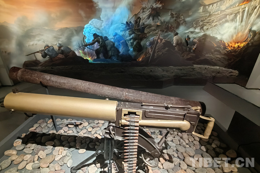 圖為宗山號角——紀(jì)念西藏江孜抗英保衛(wèi)戰(zhàn)120周年主題展現(xiàn)場,英軍當(dāng)時使用的馬克沁機槍模型(前),藏軍使用的土炮(后),背景為相關(guān)歷史場景的視覺還原。馬克沁機槍是全自動機槍,也是當(dāng)時殺傷力較大的武器,理論射速達600發(fā)/分鐘 攝影:楊月云