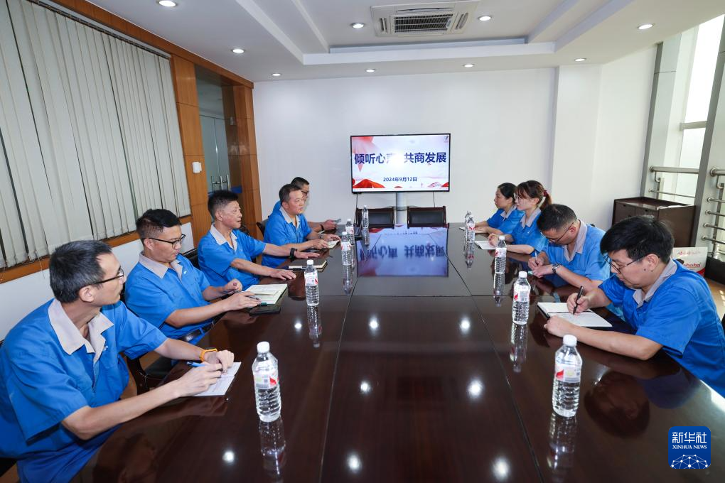 9月12日,嘉興市南湖區(qū)的人大代表曹繼華(左三)、王洪祥(左四)在企業(yè)員工座談中聽取職工意見,并現(xiàn)場解答問題。新華社記者 徐昱 攝