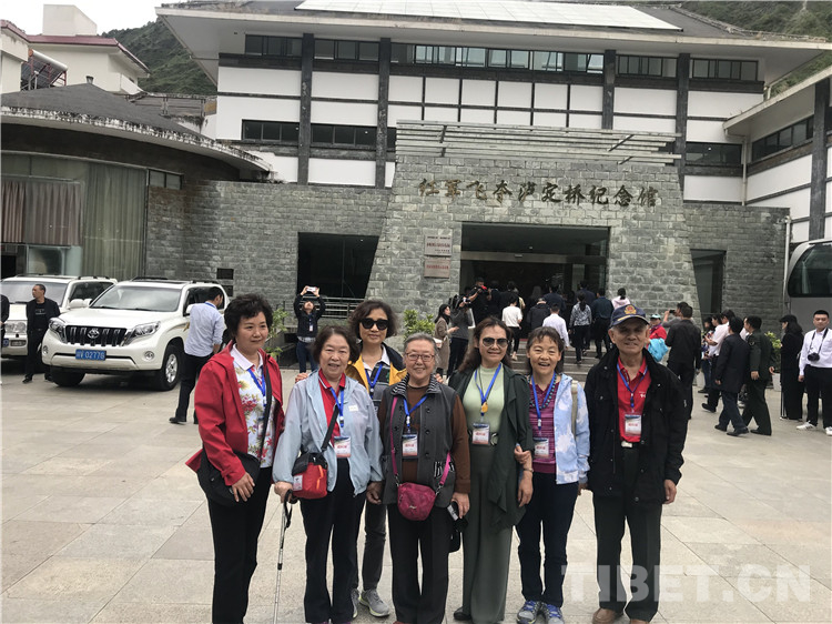十八軍老戰(zhàn)士和及其后代在紅軍飛奪瀘定橋紀(jì)念館前合影。 攝影:龍真多吉