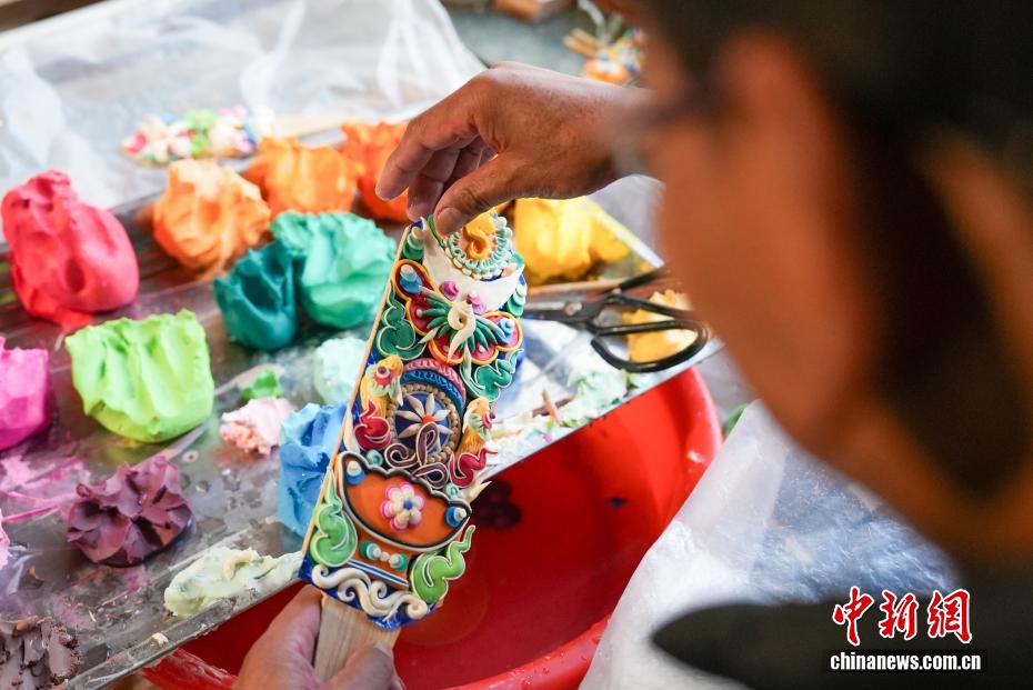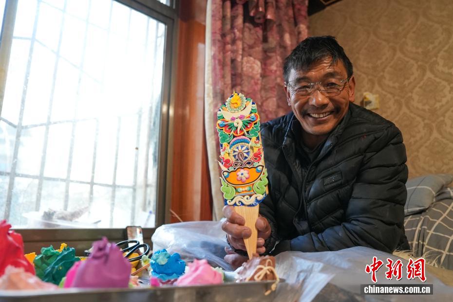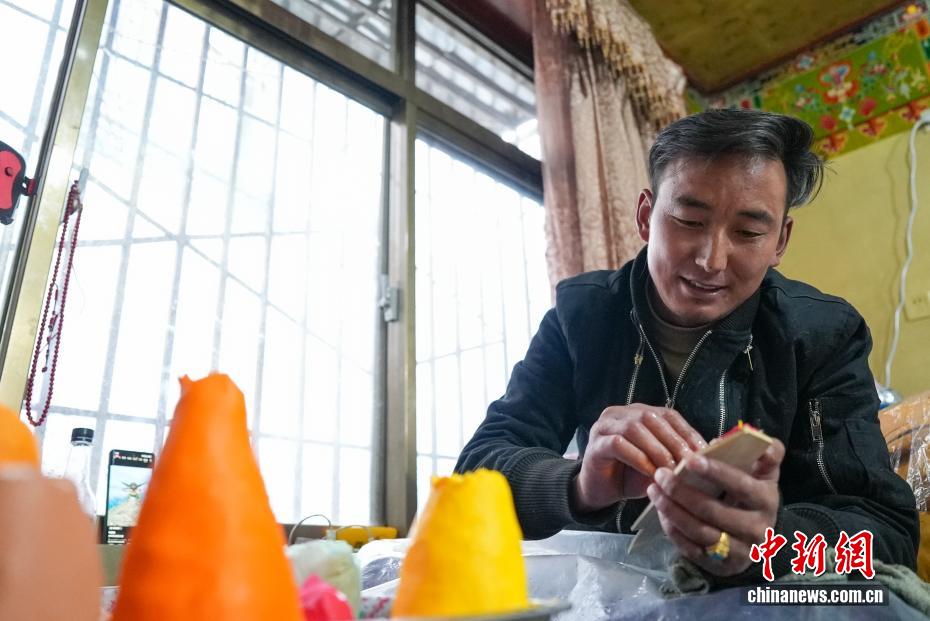 2月4日,隨著藏歷新年臨近,拉薩街頭年味漸濃,年貨市場(chǎng)上的“孜扎”迎來(lái)熱銷。酥油花藏語(yǔ)稱“孜扎”,是藏歷新年吉祥物切瑪盒的重要組件,也是藏族民眾家中必備的年貨。酥油花以酥油為主要原料,由匠人純手工捏制而成,造型涵蓋佛像、人物、花卉樹木、飛禽走獸等,常見(jiàn)圖案包含吉祥八寶、和諧四瑞、長(zhǎng)壽圖等,承載著藏族民眾對(duì)新年平安吉祥、萬(wàn)事順?biāo)斓拿篮闷碓浮D為手工藝人在制作酥油花。貢確 攝