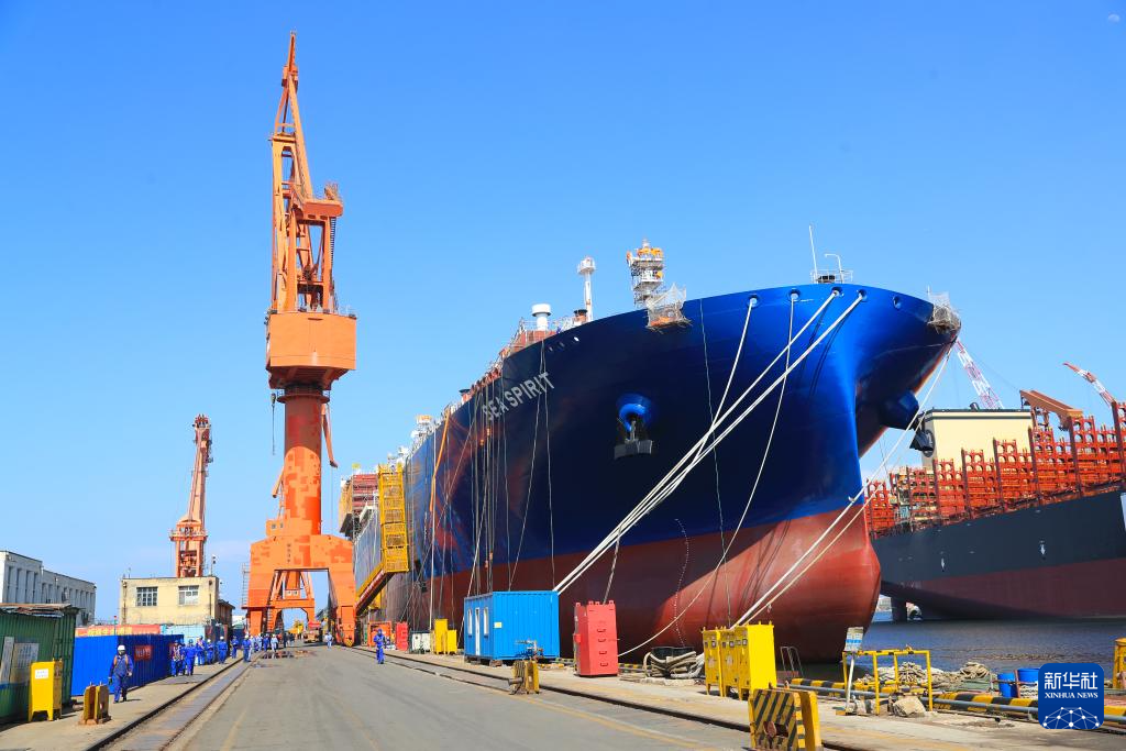 在中國(guó)船舶集團(tuán)大連船舶重工集團(tuán)有限公司拍攝的正在建造的大型液化天然氣(LNG)運(yùn)輸船(2024年6月15日攝)。