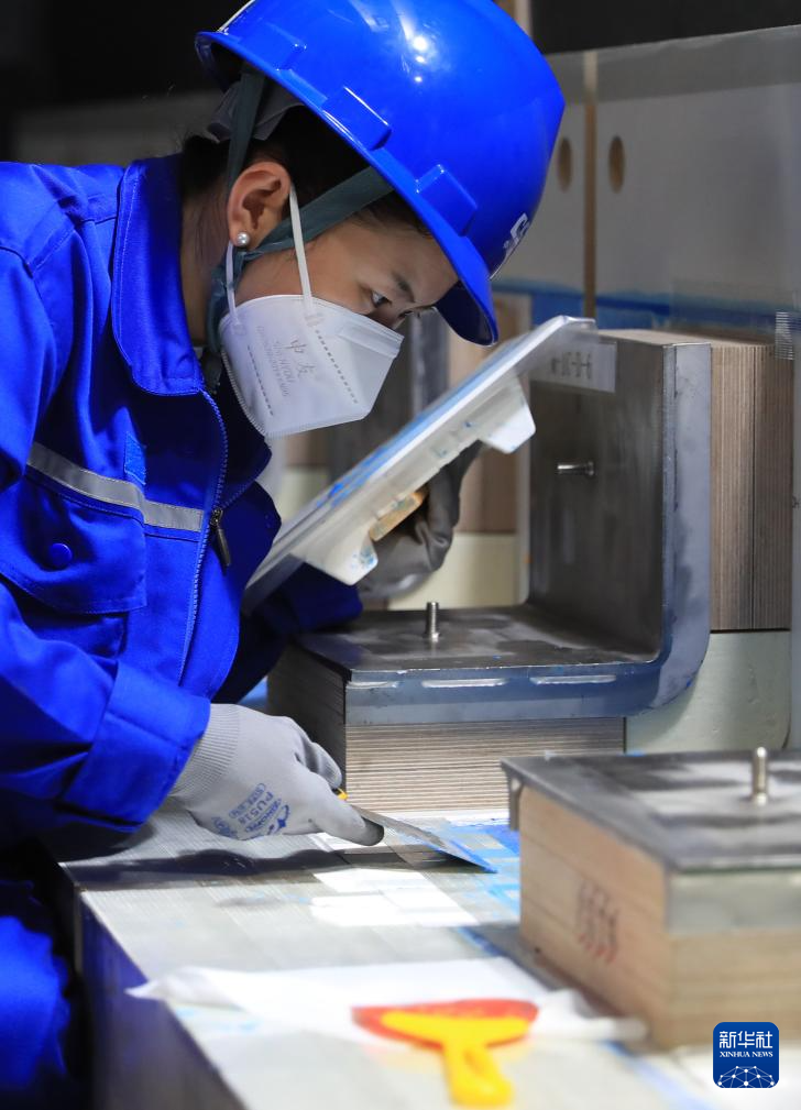 在中國(guó)船舶集團(tuán)大連船舶重工集團(tuán)有限公司LNG綜合培訓(xùn)中心,一名學(xué)員在練習(xí)次屏壁手工粘連作業(yè)(2024年6月15日攝)。