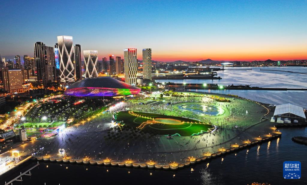 從海上遠(yuǎn)眺第十五屆夏季達(dá)沃斯論壇主會(huì)場(chǎng)大連國(guó)際會(huì)議中心(2024年6月16日攝)。