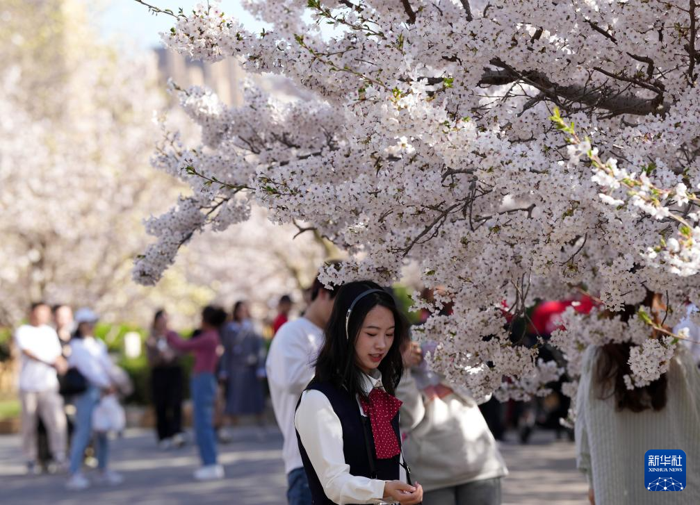 游人在大連龍王塘櫻花園內(nèi)賞花(2024年4月17日攝)。