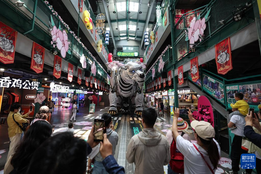 游客在遼寧省大連市熊洞街觀看仿生機(jī)械巨熊表演(2024年5月22日攝)。