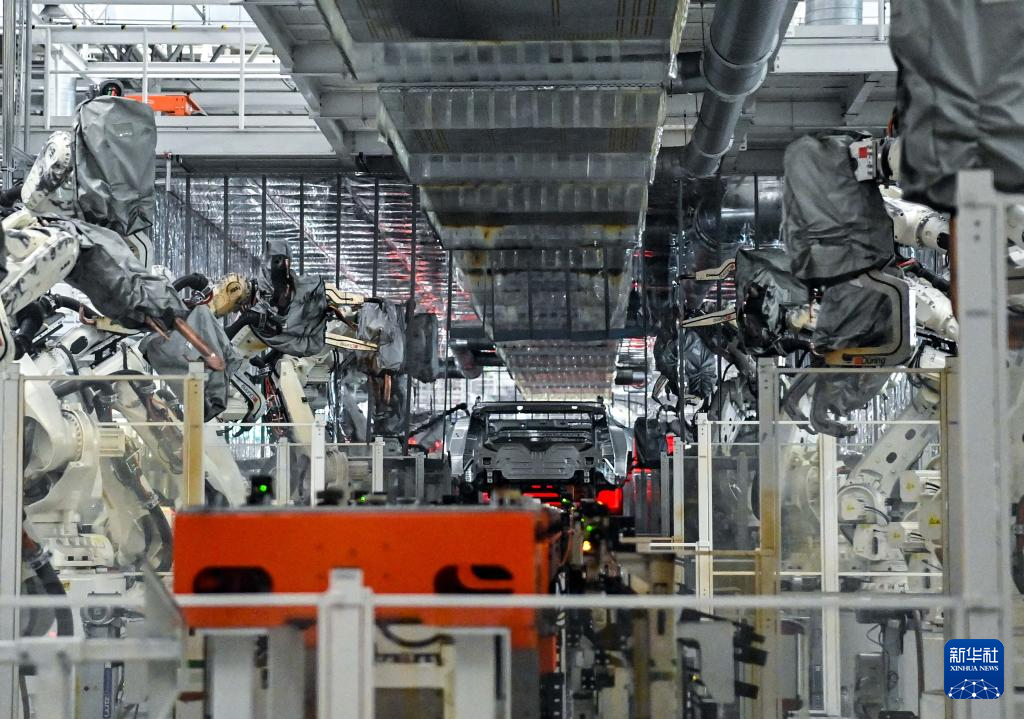 8月5日,在長春市一汽紅旗制造中心繁榮廠區(qū)的焊裝車間內(nèi),焊裝機器人在生產(chǎn)線上焊接車身。