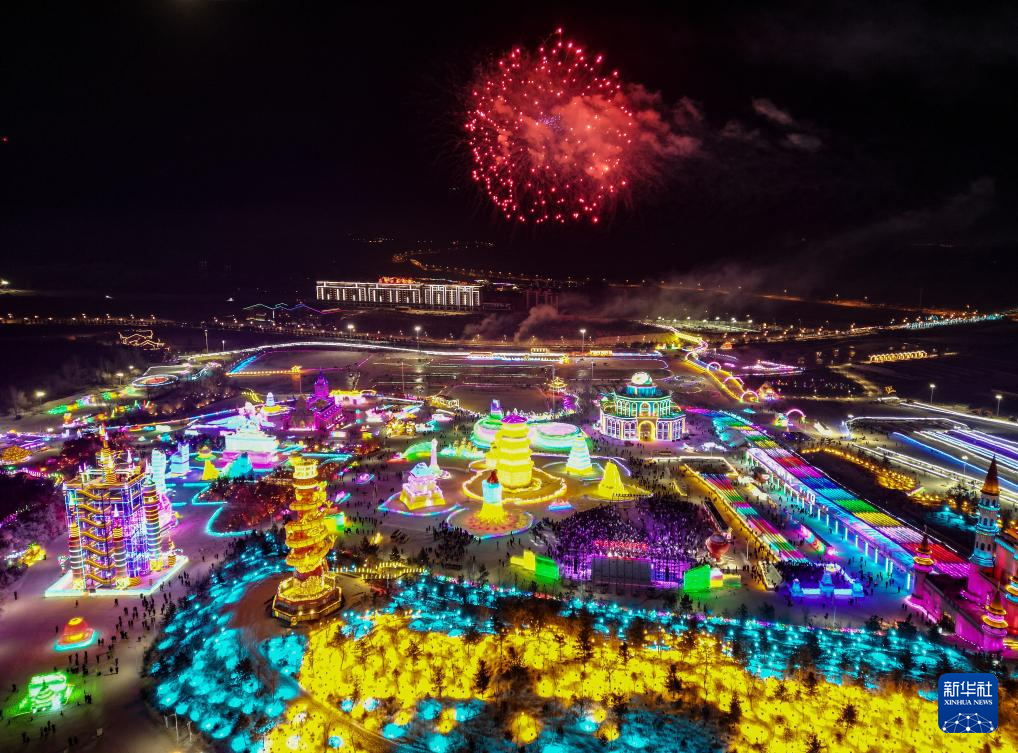 2月24日,游客在長春冰雪新天地欣賞冰燈和煙花表演(無人機照片)。