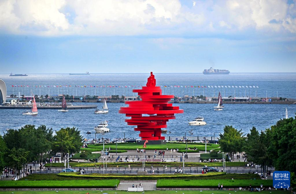 從五四廣場(chǎng)遠(yuǎn)眺青島奧林匹克帆船中心(8月19日攝)。