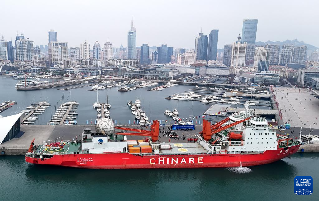 “雪龍”號(hào)極地考察船停靠青島奧帆基地碼頭(4月10日攝,無人機(jī)照片)。