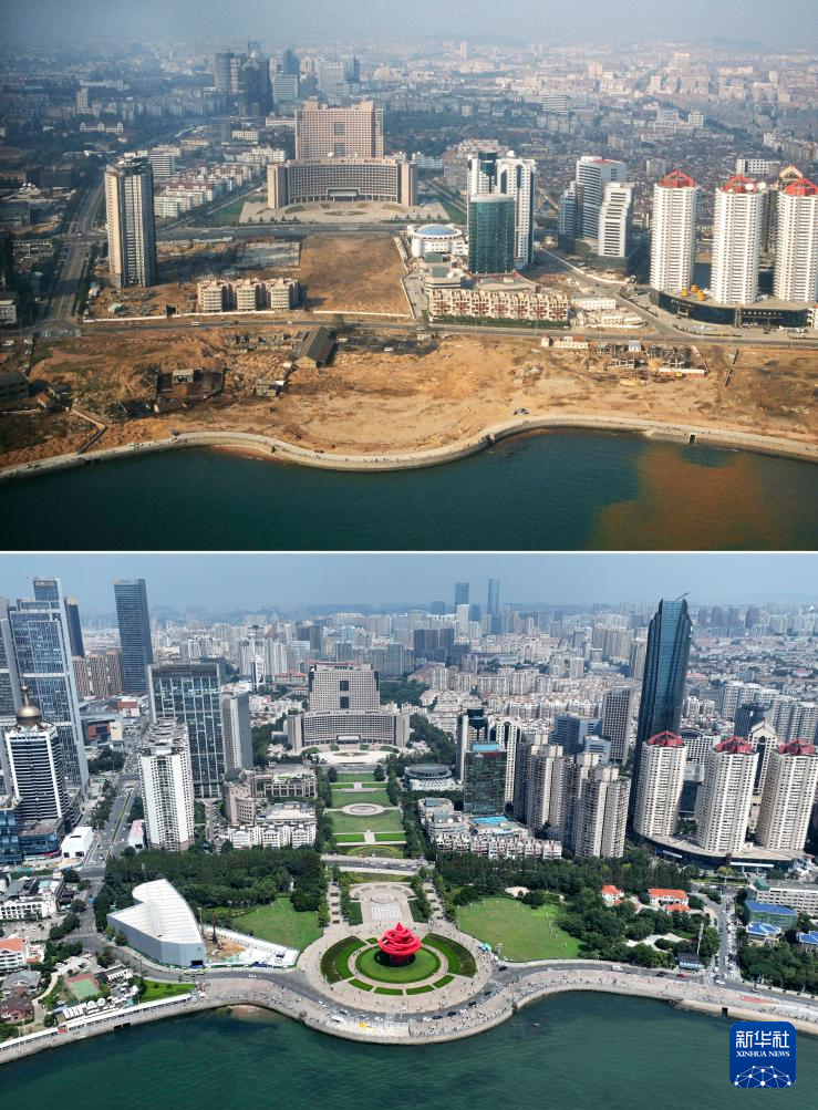 這是一張拼版照片。上圖為1996年拍攝的建設(shè)中的青島五四廣場(chǎng)(青島市委宣傳部供圖),下圖為鳥瞰青島五四廣場(chǎng)景色(8月17日新華社記者李紫恒攝,無人機(jī)照片)。