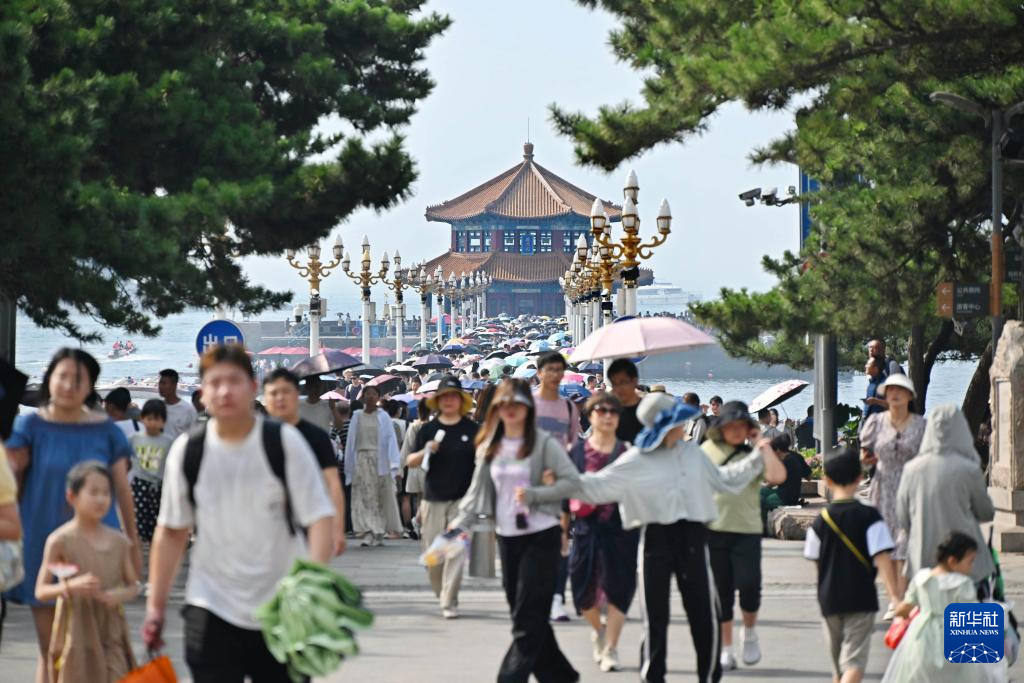 人們?cè)谇鄭u市南區(qū)棧橋景區(qū)游玩(8月17日攝)。