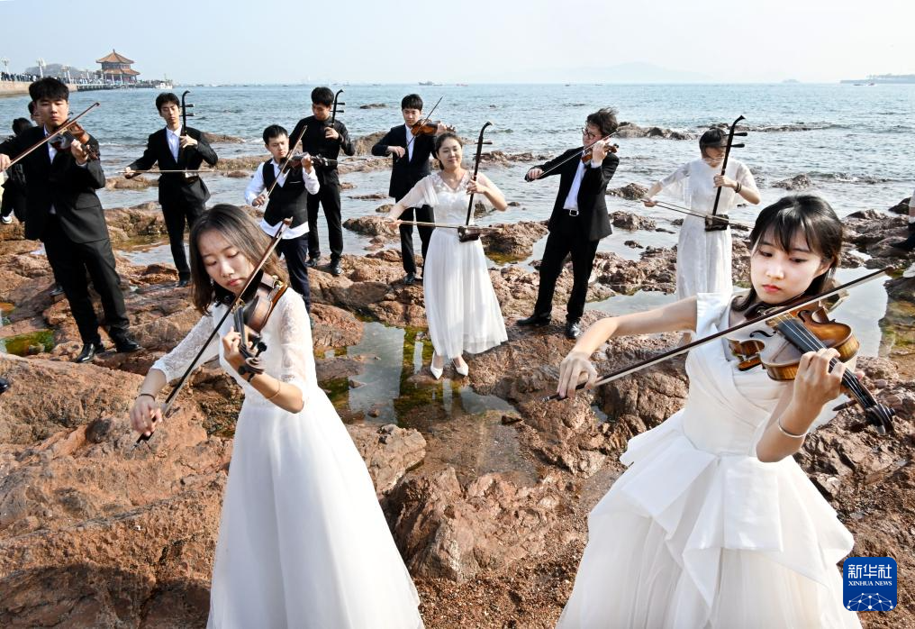 中國(guó)海洋大學(xué)藝術(shù)系學(xué)生在青島市市南區(qū)棧橋景區(qū)演奏(4月18日攝)。