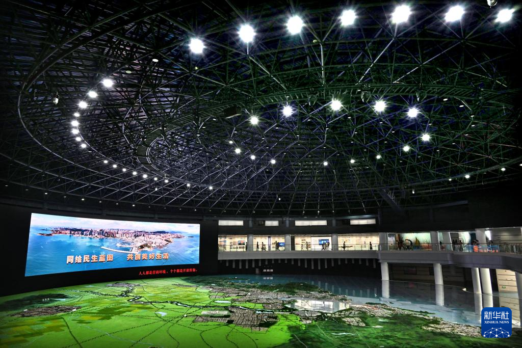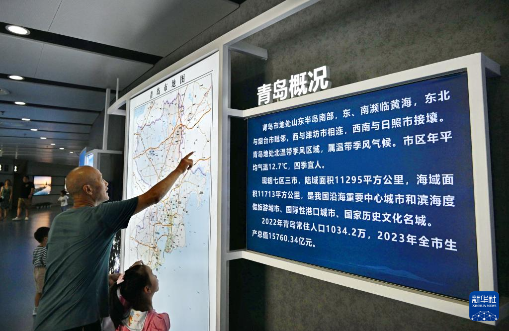 人們?cè)谇鄭u城市展覽館內(nèi)參觀(8月17日攝,無人機(jī)照片)。