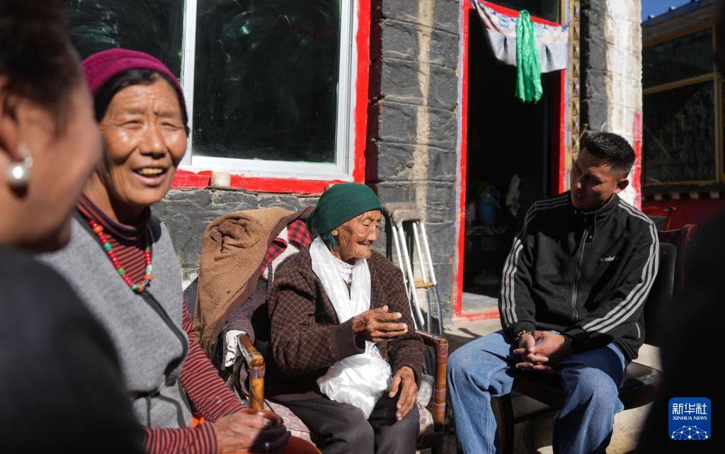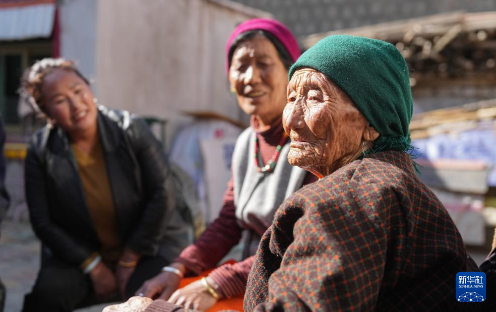 某朗桑姆(中)跟女兒及街坊開(kāi)玩笑(3月20日攝)。新華社記者 晉美多吉 攝