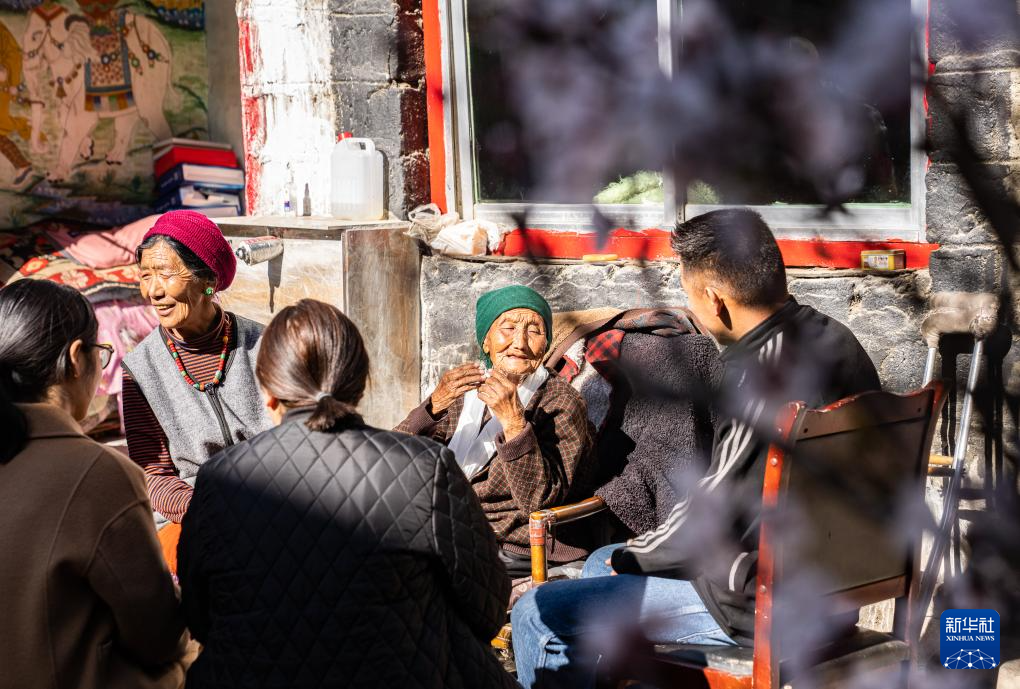 某朗桑姆(右二)和女兒及街坊在家中院子里聊天(3月20日攝)。新華社記者 丁增尼達(dá) 攝