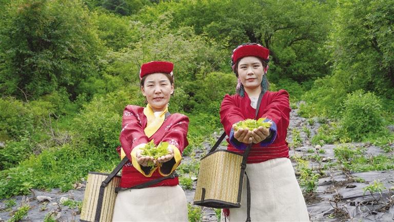 門巴族姑娘展示剛采的茶葉。