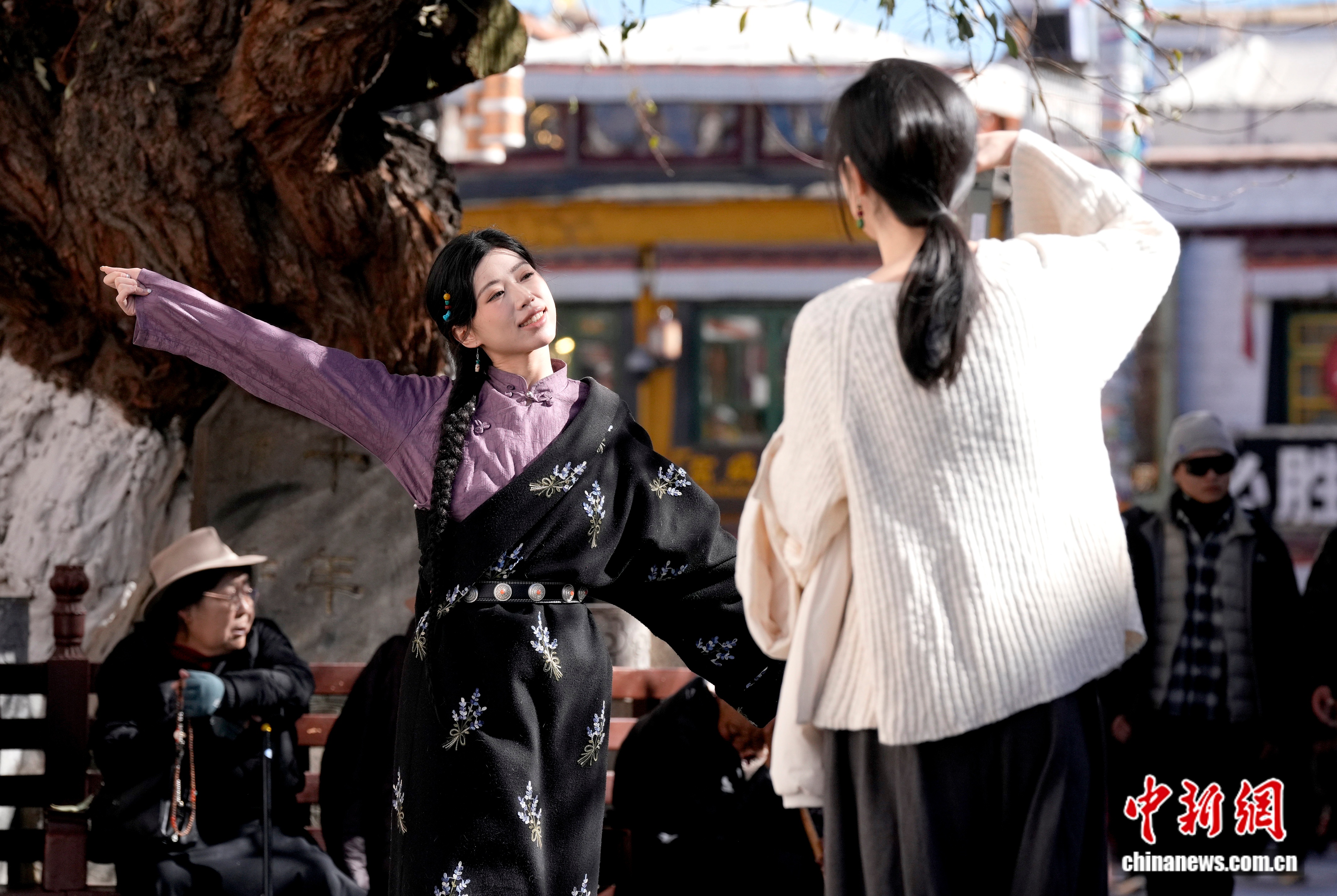 2025年12月24日,游客在拉薩市八廓街拍攝藏服寫真。在第八輪“冬游西藏”活動持續(xù)推動下,不少游客選擇在冬季走進西藏,感受雪域高原的獨特魅力。中新社記者 李林 攝