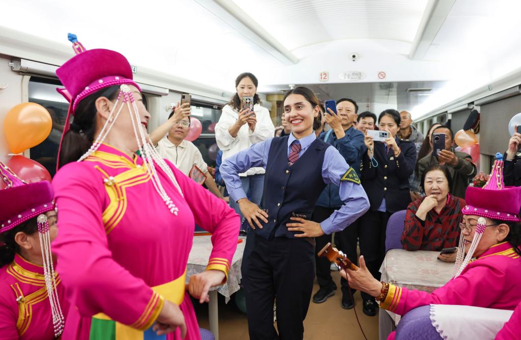 在由喀什開往成都西的列車上,塔吉克族列車長艾爾開牙·多力開與民間藝人一起跳舞(2024年4月19日攝)?;貞浫肼毥?jīng)歷,艾爾開牙·多力開說:“這是一次幸福的機遇?!?019年,為助力脫貧攻堅,鐵路部門在新疆喀什、和田等地招錄1000多名應(yīng)屆畢業(yè)生。剛走出大學校門的艾爾開牙·多力開抱著試一試的心態(tài),帶著對遠方的憧憬,與鐵路結(jié)緣。在擔任列車員的四年時間里,艾爾開牙·多力開一步步成長,工作出勤、作業(yè)規(guī)范等考核都名列前茅。2023年下半年,她以優(yōu)異成績通過系列綜合測評,成為我國首位塔吉克族列車長。新華社記者 胡虎虎 攝