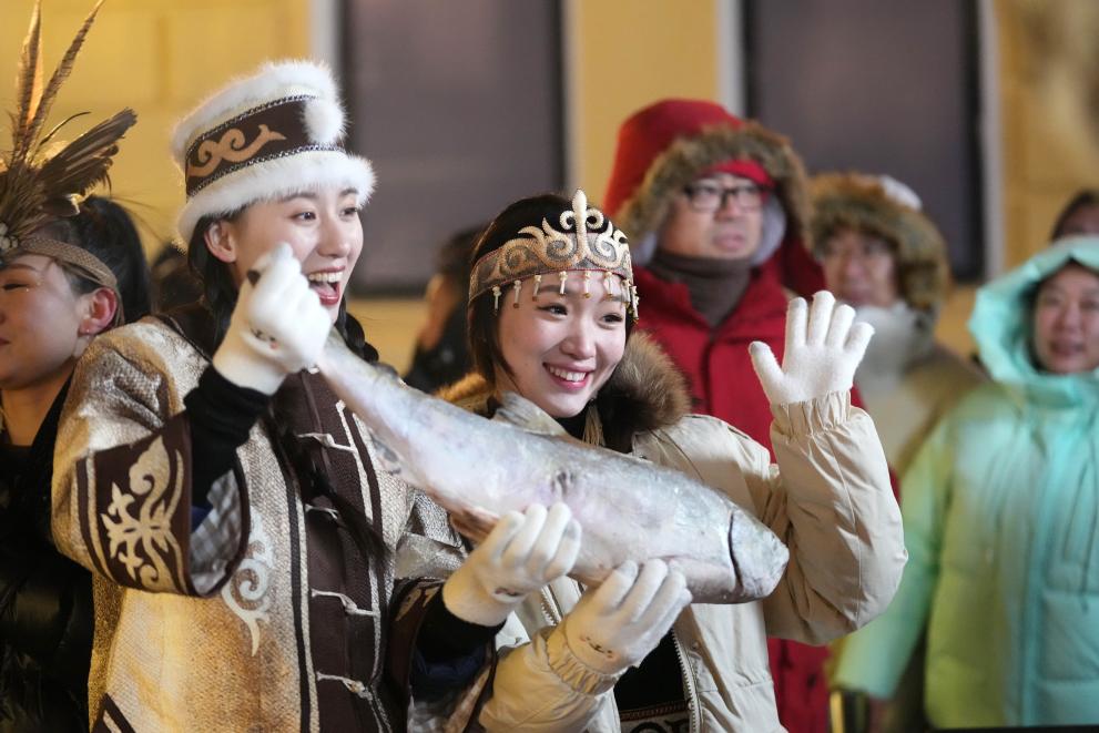 2024年1月6日,戴著魚皮頭飾的赫哲族姑娘(右)與黑龍江省饒河縣文旅推薦官在哈爾濱中央大街上推介家鄉(xiāng)特產(chǎn)魚品,讓天南海北的游客感受到濃郁的赫哲民族風情。新華社記者 王建威 攝