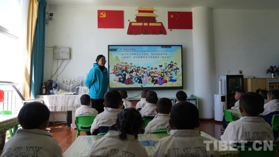 在西藏日喀則市拉孜縣第二幼兒園中(1)班教室里,老師郁瓊珠姆話(huà)音剛落,孩子們的回答便齊聲響起,清脆而堅(jiān)定。屏幕上,56個(gè)民族的卡通形象匯聚于一幅畫(huà)之中。她接著問(wèn)道:“那我們國(guó)家遼闊的土地上,生活著多少個(gè)民族?”一只只小手高高舉起,搶答聲此起彼伏:“56個(gè)!”對(duì)孩子們而言,這些答案已經(jīng)成為日常學(xué)習(xí)生活中耳濡目染的常識(shí)。