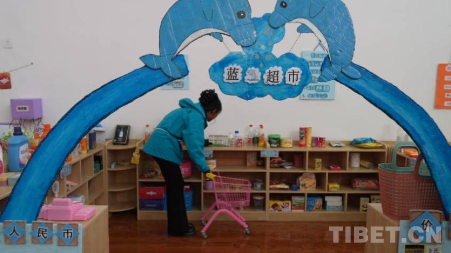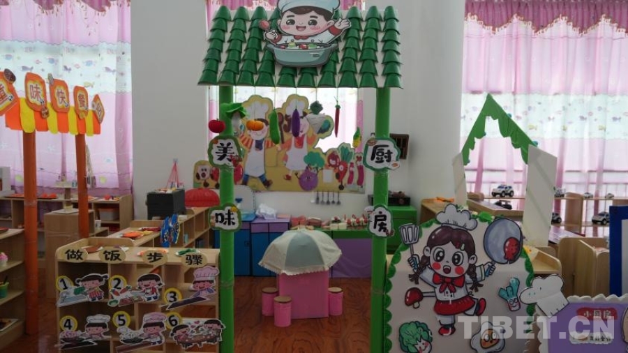 活動(dòng)室內(nèi),分區(qū)域模擬了娃娃家、警察局、理發(fā)店、小廚房、超市、醫(yī)院等生活場(chǎng)景?!按蟛糠中∨笥堰€處于不識(shí)字的階段,所以我們盡量用圖片等形式幫助他們理解每個(gè)場(chǎng)景、每個(gè)步驟。”在這個(gè)手工打造的小小“社區(qū)”里,孩子們通過(guò)角色扮演,模擬超市選購(gòu)與結(jié)賬、醫(yī)院掛號(hào)就醫(yī)、照顧家庭成員、理發(fā)、烹飪等生活場(chǎng)景。如果發(fā)現(xiàn)其他小朋友的“不良”行為,甚至可以前去“警察局”按流程“報(bào)案”。不同于其他的商業(yè)化兒童場(chǎng)景模擬體驗(yàn)區(qū)域,拉孜縣第二幼兒園活動(dòng)室的道具大部分由教師們制作而成,手工打造的8個(gè)模擬場(chǎng)景盡顯用心和細(xì)致。