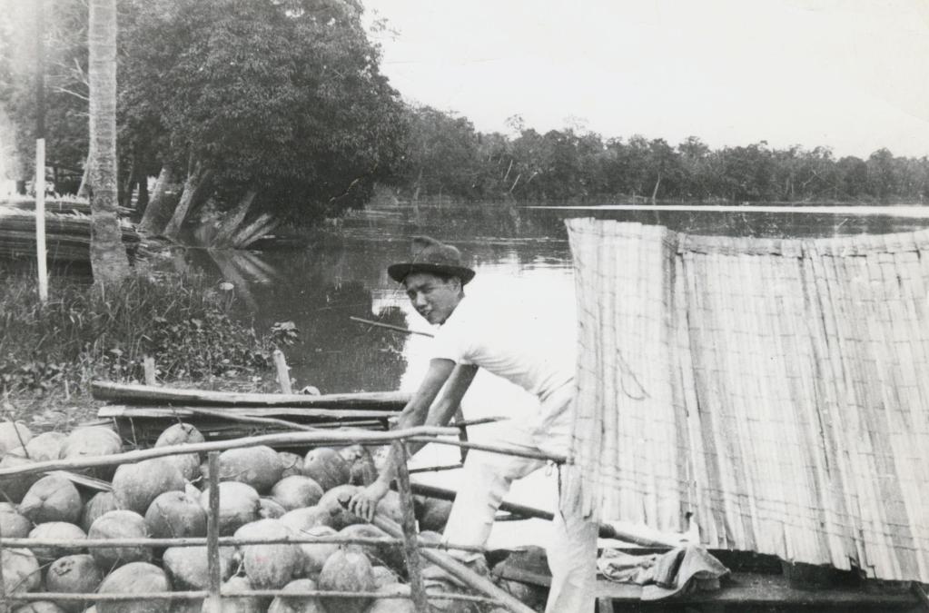 1938年,張智源在馬來半島裝運椰子。 新華社發(fā)