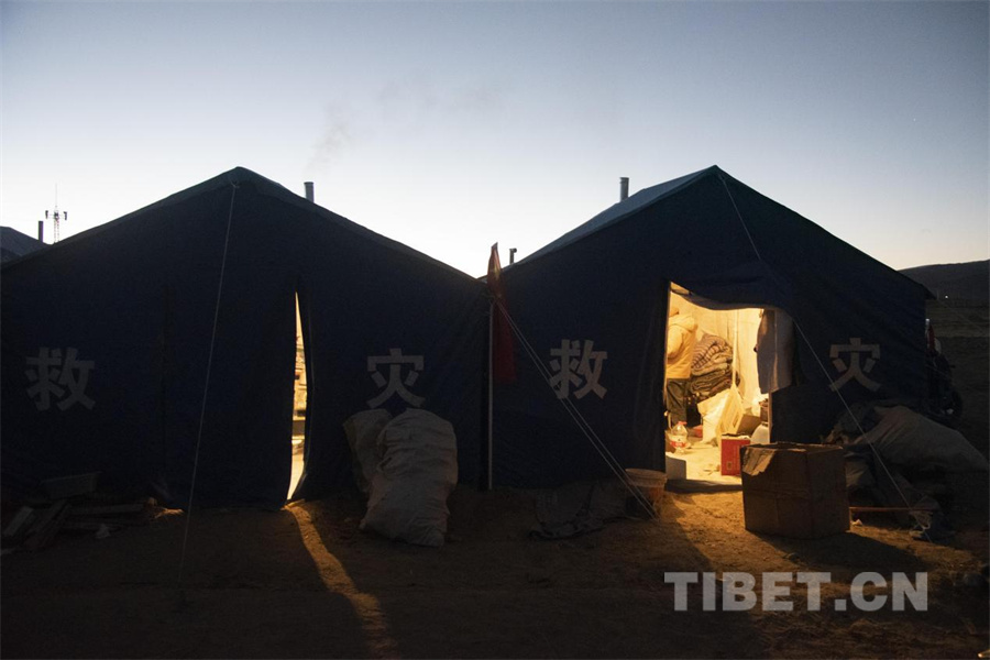 圖為地震發(fā)生第四日,夜幕即將降臨之時定日縣長所鄉(xiāng)雜村受災(zāi)群眾安置點內(nèi)救災(zāi)帳篷中泛起暖光(攝于2025年1月10日) 攝影:趙振宇