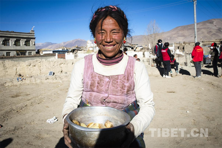 圖為在定日縣受災(zāi)群眾安置點,受災(zāi)群眾拿出家中煮熟的最好的土豆給每一位“客人”分發(fā)(攝于2025年1月14日) 攝影:趙振宇